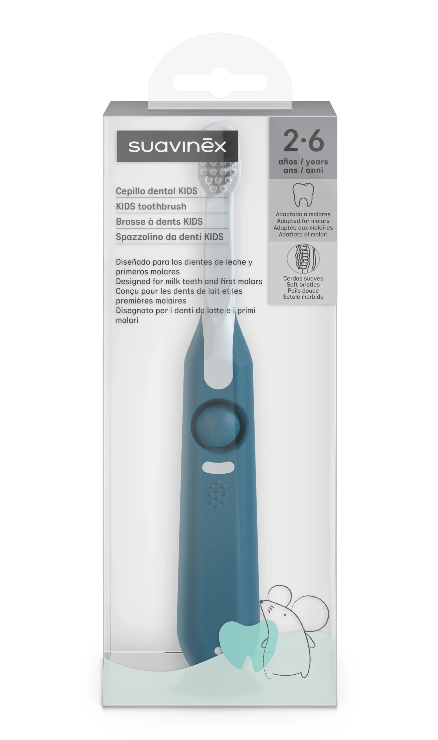 Зубна щітка Suavinex Stage 2 спеціально розроблена для дітей віком від 2 до 6 років. Має прямокутну голівку з м’якою, нейлоновою щетиною із закругленими кінчиками, яка повторює форму «гори» — для ефективного очищення кутніх зубів.